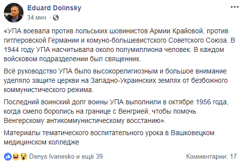 В Вашковецком медицинском колледже на Буковине студентам на занятиях рассказывают о том, как "УПА воевала против польских шовинистов". Об этом сообщил директор Украинского еврейского комитета Эдуард Долинский на своей странице в социальной сети Facebook.