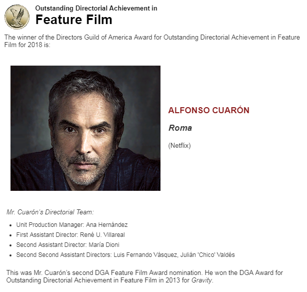 Гильдия режиссеров США вручила режиссеру награду за "Выдающиеся достижения в области режиссуры художественного фильма" в 2018 году. Куарон уже получал премию Гильдии в 2013 году за фильм "Гравитация".