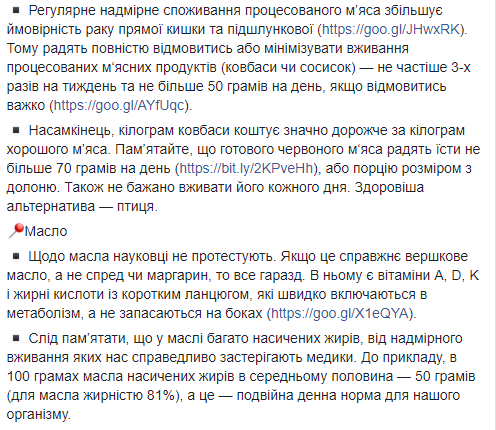 "Колбаса, как обидно для многих это ни было бы услышать - нездоровая всем. В ней также много соли. К примеру, в 100 граммах салями половина дневной нормы соли. Это процесованый мясной - глубоко переработанный продукт, содержащий примеси, в частности, нитрит и бензпирен. Регулярное чрезмерное потребление такого мяса увеличивает вероятность рака прямой кишки и поджелудочной", - предостерегает Супрун.