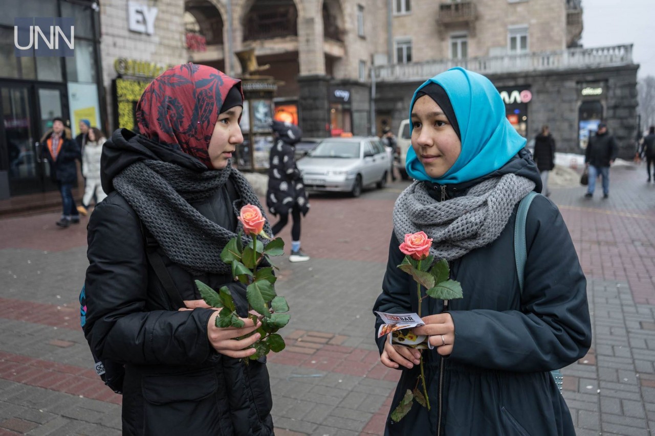 Возле станции метро "Крещатик" девушки и женщины в ярких хиджабах дарили украинкам розы и отвечали на вопросы прохожих.