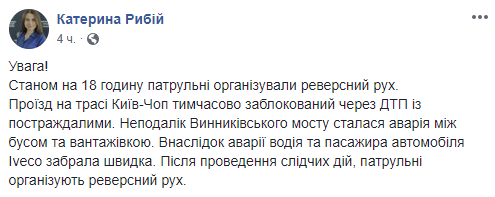 "По состоянию на 18 часов патрульные организовали реверсивное движение. Проезд на трассе Киев–Чоп временно заблокирован из-за ДТП с пострадавшими. Неподалеку Винникивского моста произошла авария между микроавтобусом и грузовиком", - сказано в сообщении.