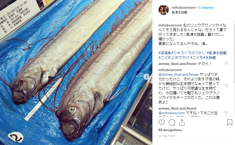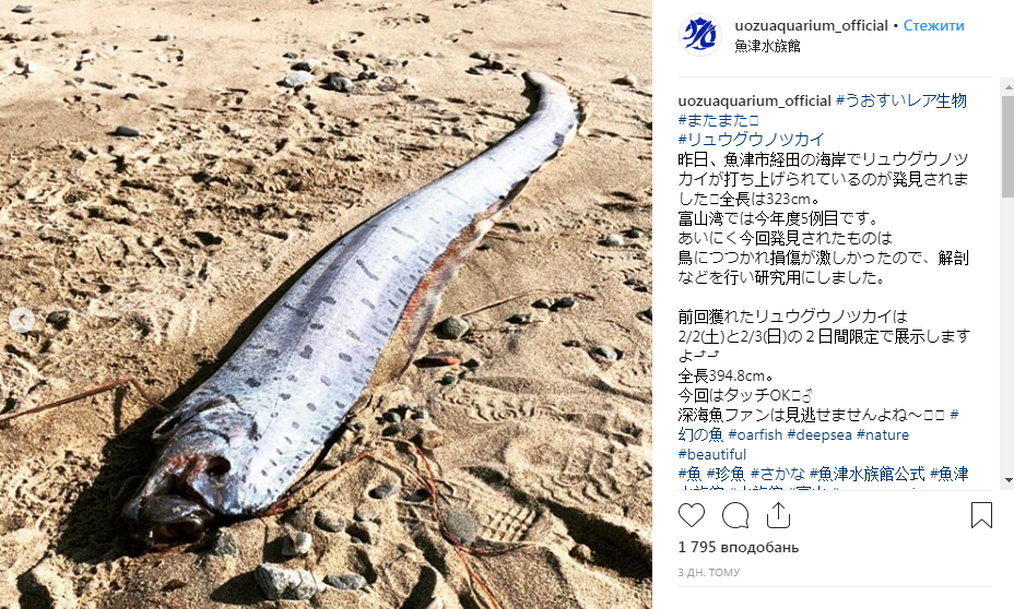 В Японии на побережье залива Тояма выбросился огромный сельдяной король длиной в 3,2 метра. Фото редкой рыбы опубликовали в Instagram.