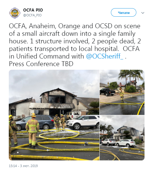 В США 3 февраля произошла еще одна авиационная катастрофа. Легкий двухмоторный самолет Cessna 414A рухнул прямо на жилые дома в городке Йорба-Линда (штат Калифорния). Как сообщила в официальном  Twitter пожарная охрана города в результате крушения были разрушены и вспыхнули два дома.