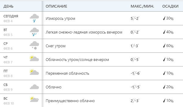 Сайт Weather.com сообщает, что самым теплым днем недели будет понедельник, когда воздух прогреется до +5. Во вторник, среду и четверг - до 0...+1. В пятницу и субботу немного похолодает до -1, а в воскресенье вновь потеплеет до +2. Из осадков в понедельник и вторник этот сайт обещает ледяную изморозь и снег в среду.
