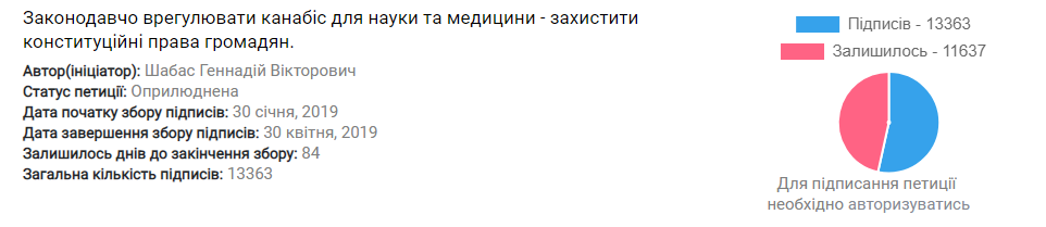 Петиция о законодательном урегулировании каннабиса для науки и медицины на сайте Верховной Рады на вечер 4 февраля набрала 13 3630 подписей из необходимых 25 000, и это произошло  меньше чем за неделю - за 6 дней после создания петиции.