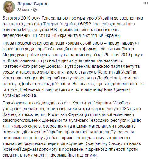 Дело возбуждено по обращению народного депутата от "Народного фронта" Андрея Тетерука (входит в правящую коалицию). "Виктор Медведчук сделал громкое заявление на партийном съезде 29 января 2019 в г. Киеве, заявив о необходимости образования так называемого" автономного региона Донбасс "с образованием собственного парламента и правительства, а также о закреплении такого статуса в Конституции Украины", - написала Сарган.
