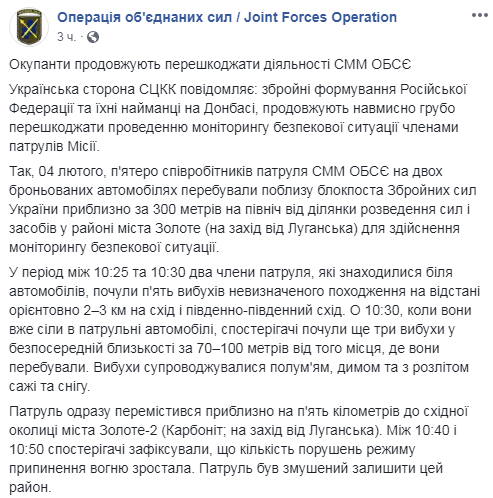 В понедельник, 4 февраля, в районе Золотого Луганской области патруль СММ ОБСЕ попал под обстрел. Об этом сообщается на странице операции Объединенных сил в соцсети Facebook.
