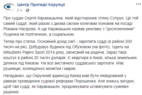 "О судье Сергее Каракашьяне, который отстранил Ульяну Супрун. Это тот самый судья, который вместе с двумя своими коллегами восстановил в должности Романа Насирова. А еще Каракашьян назвал рекламу с "достижениями" Луценко не политической, а социальной", - говорится в сообщении организации.