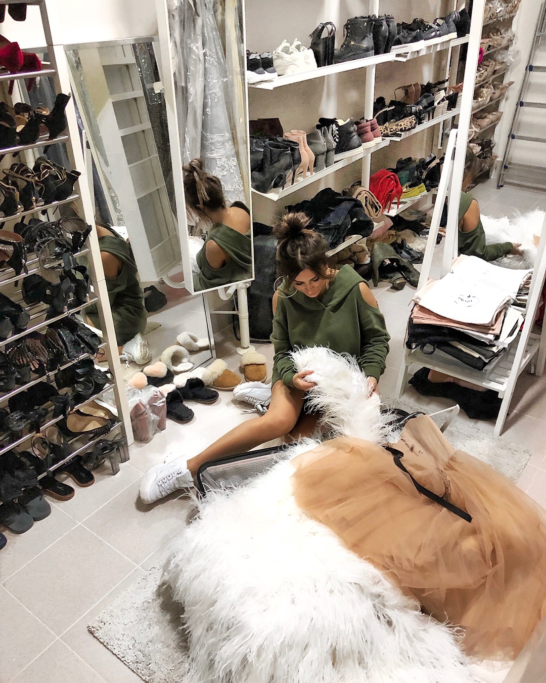 В Instagram-stories можно увидеть, как певица позирует в авто с собранными гладко зачесанными волосами в стильном черном пуховике и с чокером на шее. В кадре она появилась, складывая губы "уточкой". Впрочем, на снимке Ани Лорак заметно увлеклась тоном для лица. Вслед за снимком следует видео, где певица в домашней одежде с собранными на затылке волосами разбирает обувной шкаф.