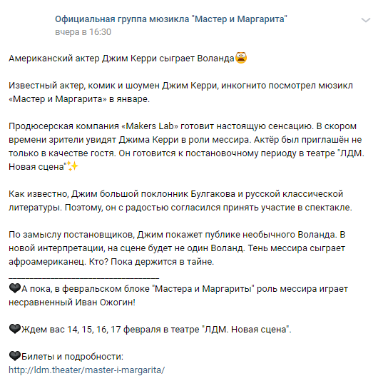 "В скором времени зрители увидят Джима Керри в роли мессира. Актер был приглашён не только в качестве гостя. Он готовится к постановочному периоду в театре "ЛДМ. Новая сцена"... По замыслу постановщиков, Джим покажет публике необычного Воланда. В новой интерпретации на сцене будет не один Воланд. Тень мессира сыграет афроамериканец", - сказано в сообщении.