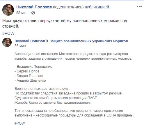 "Мосгорсуд оставил первую четверку военнопленных моряков под стражей", - написал он. Жалобы касались Владимира Терещенко, Сергея Попова, Богдана Головаша, Андрея Шевченко. По ходатайству следствия заседание прошло в закрытом режиме. Суд отказался приобщить копию резолюции ПАСЕ, сообщил Полозов. "Тактическая задача по обжалованию продления меры пресечения выполнена - необходимые процедуры для обращения в ЕСПЧ пройдены", - написал адвокат.