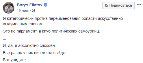 "Я категорически против переименования области искусственно выдуманным словом. Это не парламент, а клуб политических самоубийц. И, да, я абсолютно спокоен. Все равно у них ничего не выйдет. Вот увидите", - написал в Facebook Филатов.