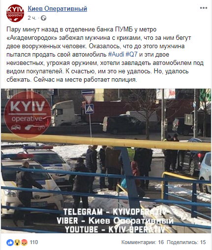 Очевидцы сообщили, что инцидент произошел около 14:20. В отделение банка ПУМБ возле станции метро забежал мужчина. Он кричал, что за ним гонятся неизвестные. Выяснилось, что потерпевший продавал свою машину Audi Q7, а двое, которые назвались покупателями, принесли на встречу оружие. Они попытались завладеть автомобилем, но им это не удалось.