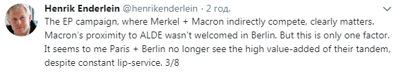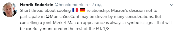 По данным немецкого издания, ранее упоминались "трудности с расписанием", однако "есть впечатление охлаждения германо-французских отношений". Как пояснил доверенное лицо Макрона Хенри Ендерляйн, отказ от совместного выступления является "символическим сигналом".