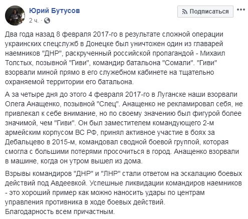 "Два года назад 8 февраля 2017-го в результате сложной операции украинских спецслужб в Донецке был уничтожен один из главарей наемников "ДНР", раскрученный российской пропагандой - Михаил Толстых, позывной "Гиви", командир батальона "Сомали". "Гиви" взорвали миной прямо в его служебном кабинете на тщательно охраняемой территории его батальона", - сообщил он.