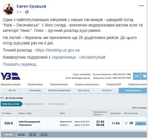 Скорый пассажирский поезд № 20/19 "Киев-Лисичанск" стал одним из самых популярных в железнодорожном сообщении страны, поэтому "Укрзализныця" назначила 26 дополнительных рейсов этого поезда в феврале-марте 2019 года. Об этом написал на своей странице в Facebook глава УЗ Евгений Кравцов.