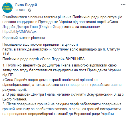 "Последовательно отстаивая принципы и ценности партии, а также демонстрируя свободу соответствии с уставом", партия решила публично обратиться к Дмитрию Гнапу с требованием отозвать свое заявление о согласии баллотироваться кандидатом на пост президента Украины от политсилы.