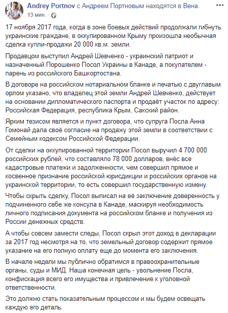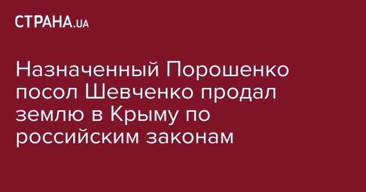 В ноябре 2017 года в аннексированном Крыму назначенный Порошенко посол Украины в Канаде Андрей Шевченко продал 20 000 кв.м. земли жителю российского Башкортостана, причем сделал он это по законам РФ, на российских бланках, получив за это российские рубли. Об этом на своей странице в Facebook написал юрист Андрей Портнов.