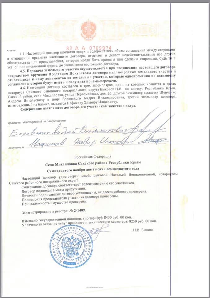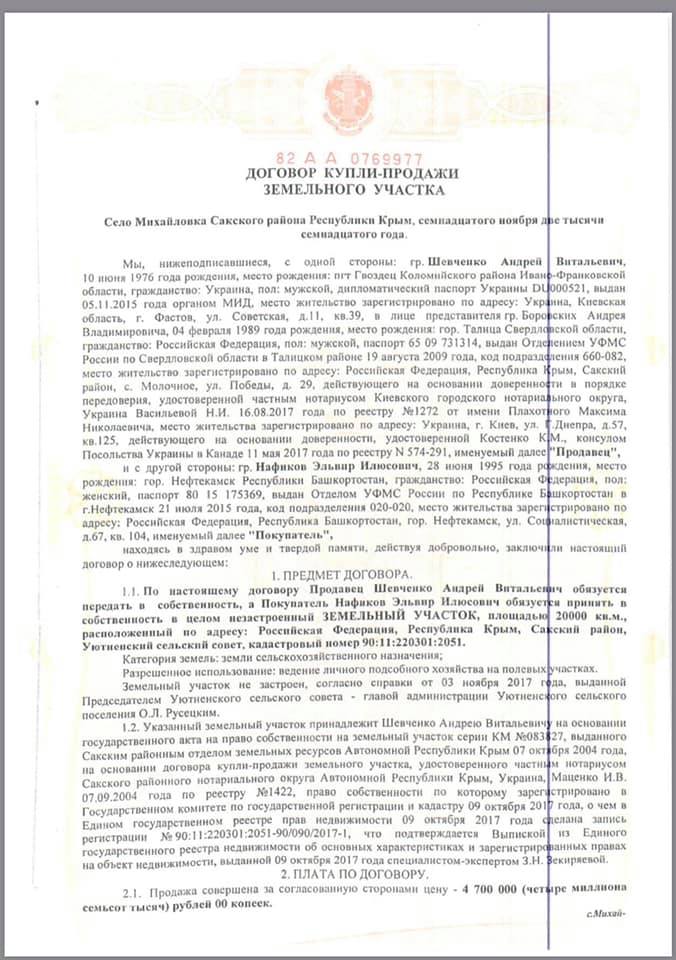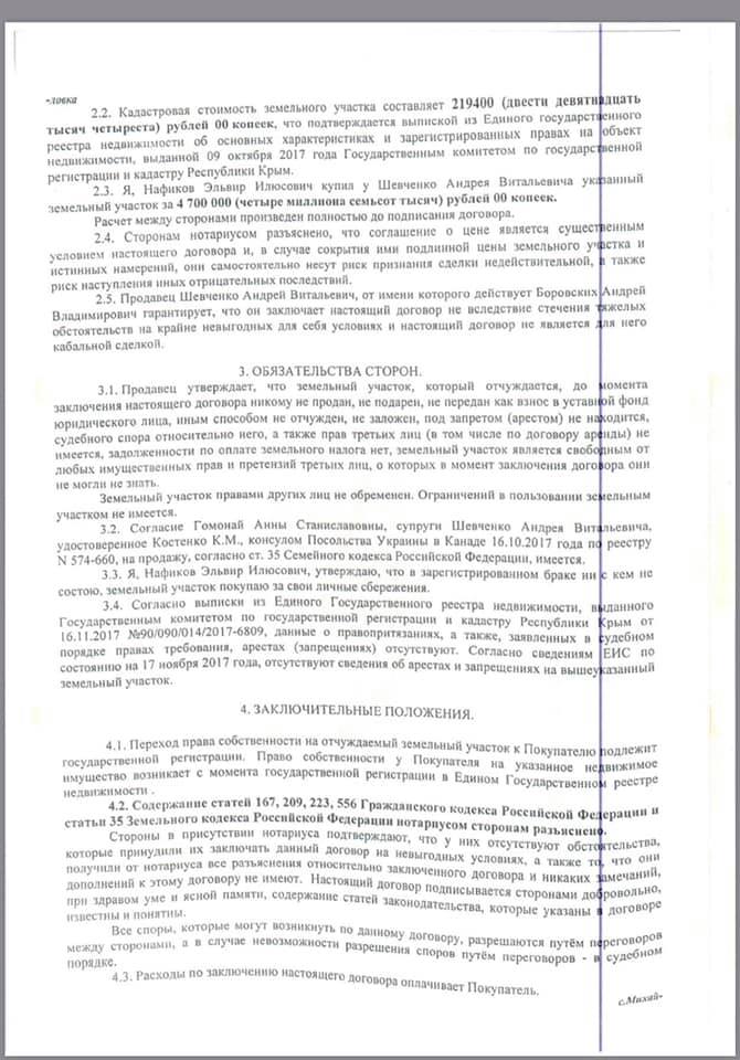 "В договоре на российском нотариальном бланке и печатью с двуглавым орлом указано, что владелец этой земли Андрей Шевченко, действует на основании дипломатического паспорта и продаёт участок по адресу: Российская Федерация, республика Крым, Сакский район. Ярким тезисом является и пункт договора, что супруга Посла Анна Гомонай дала своё согласие на продажу этой земли в соответствии с Семейным кодексом Российской Федерации", - написал Портнов, приложив снимки документа.