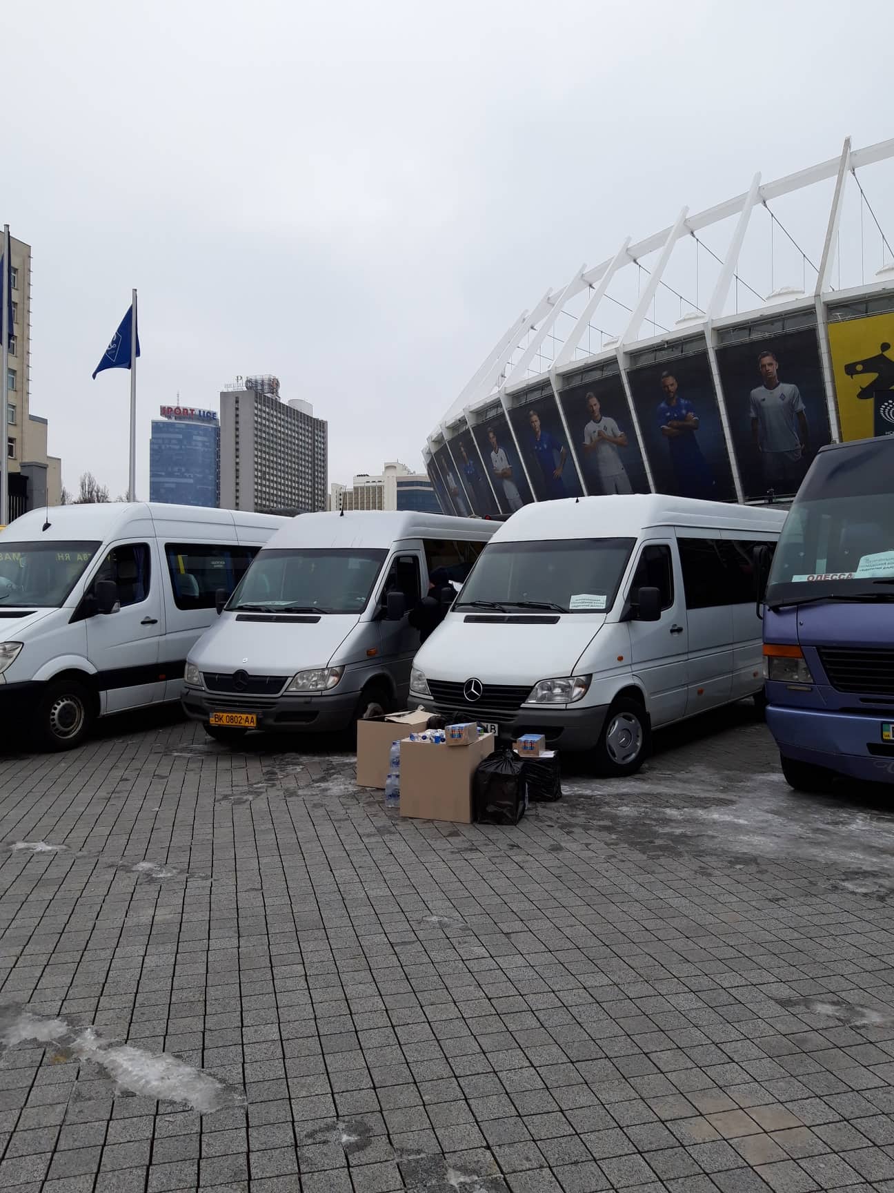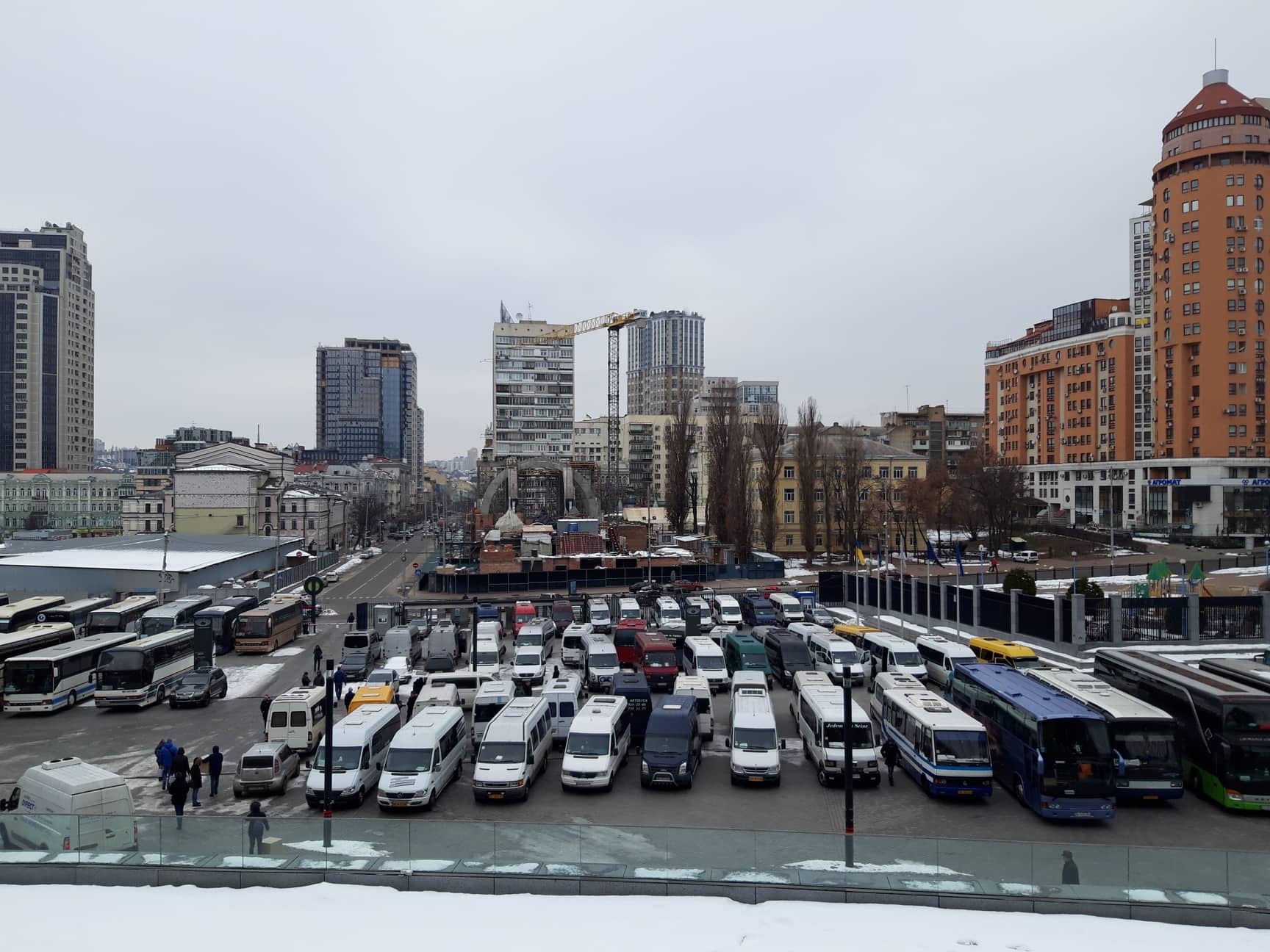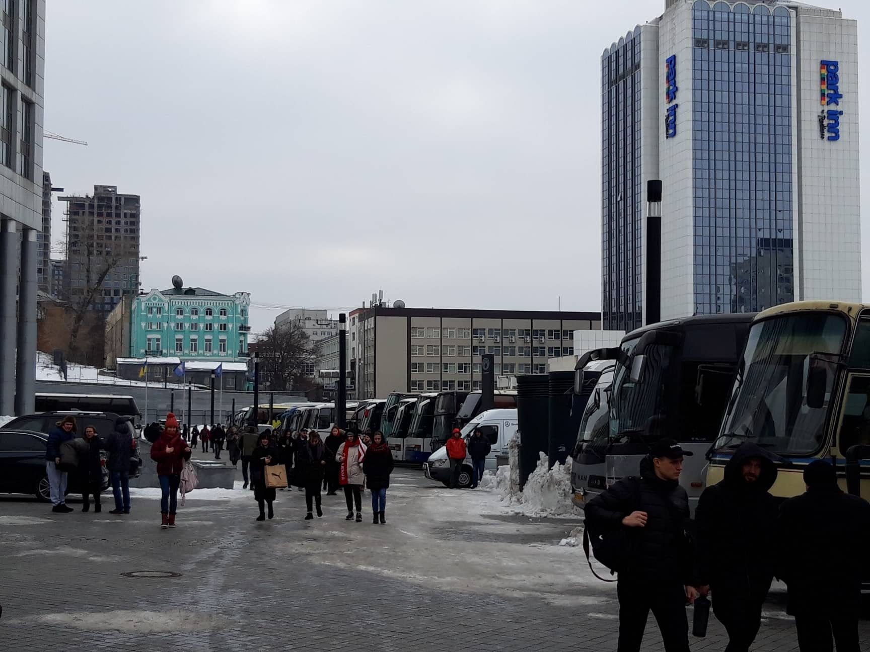 13:10 Появились панорамные фото у Дворца Спорта. С высокой точки видно количество автобусов, которые привезли людей на форум Петра Порошенко.
