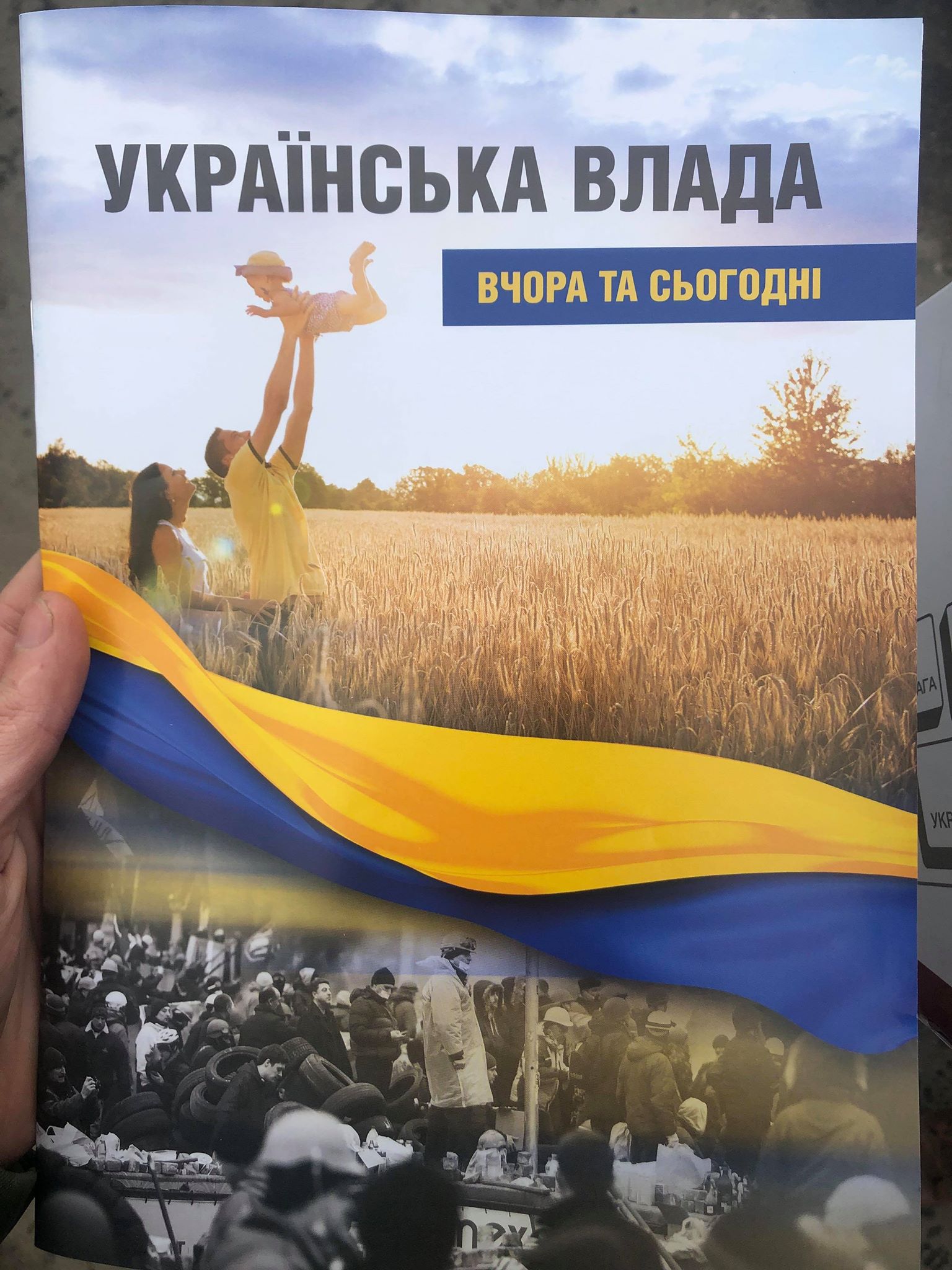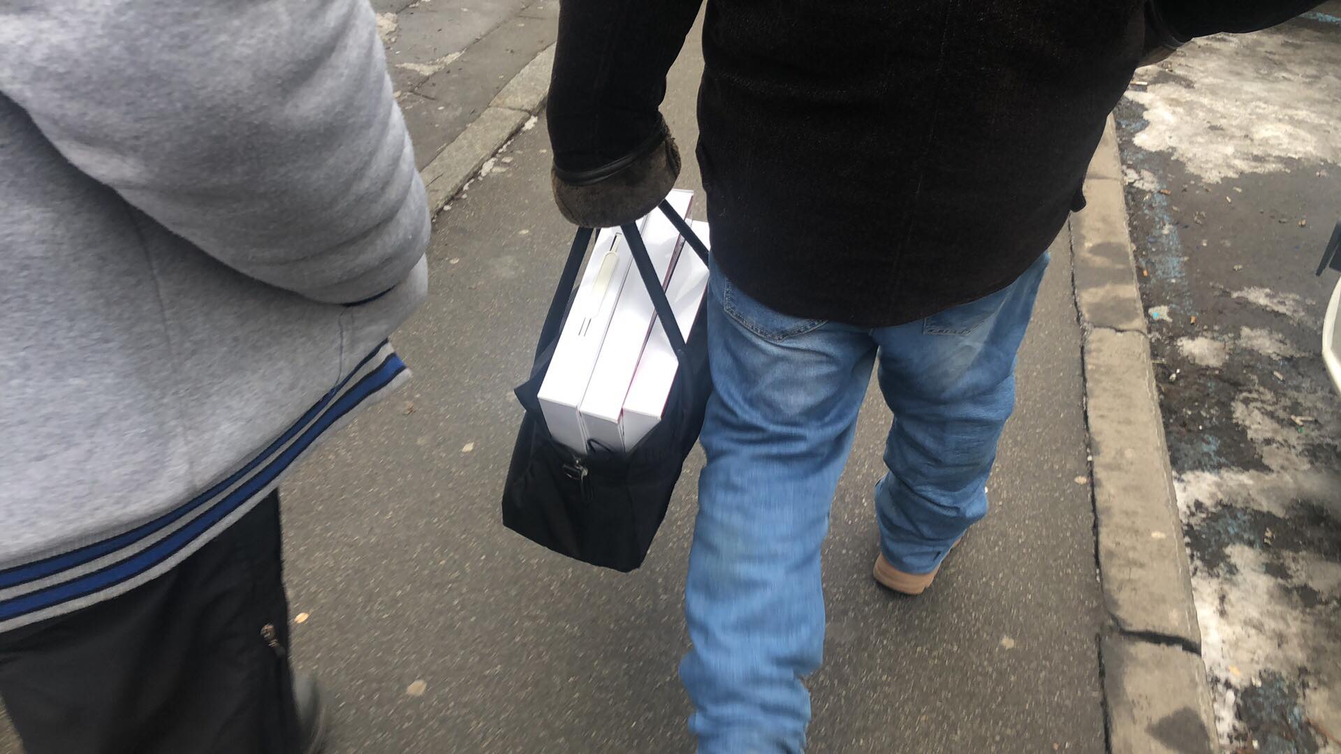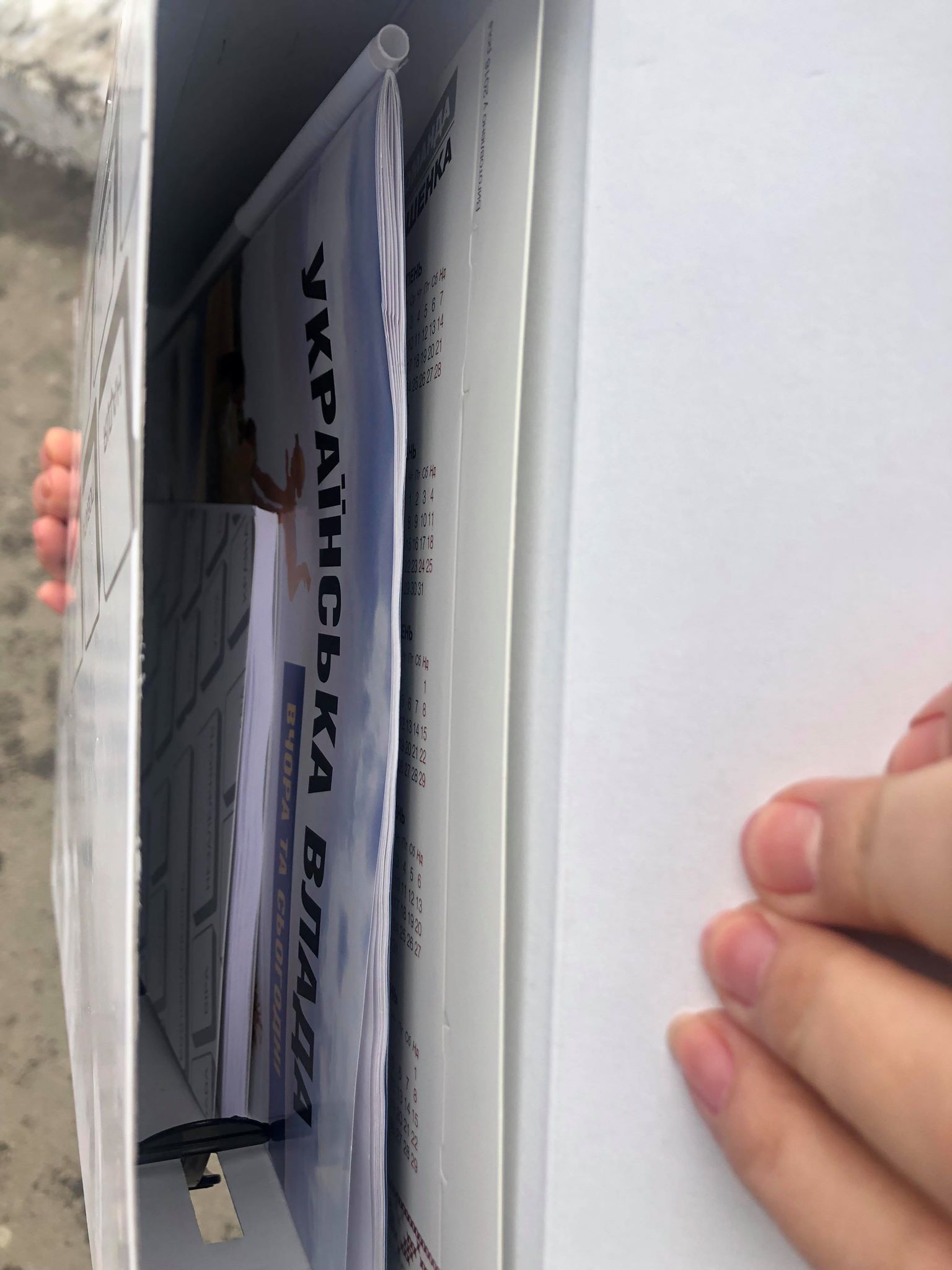 В этих же коробках портреты Порошенко в бумажной рамке, чтобы ставить на стол. Однако люди почему-то стыдливо прячут содержимое пакетов, в которых еще флаг на пластиковой ножке.