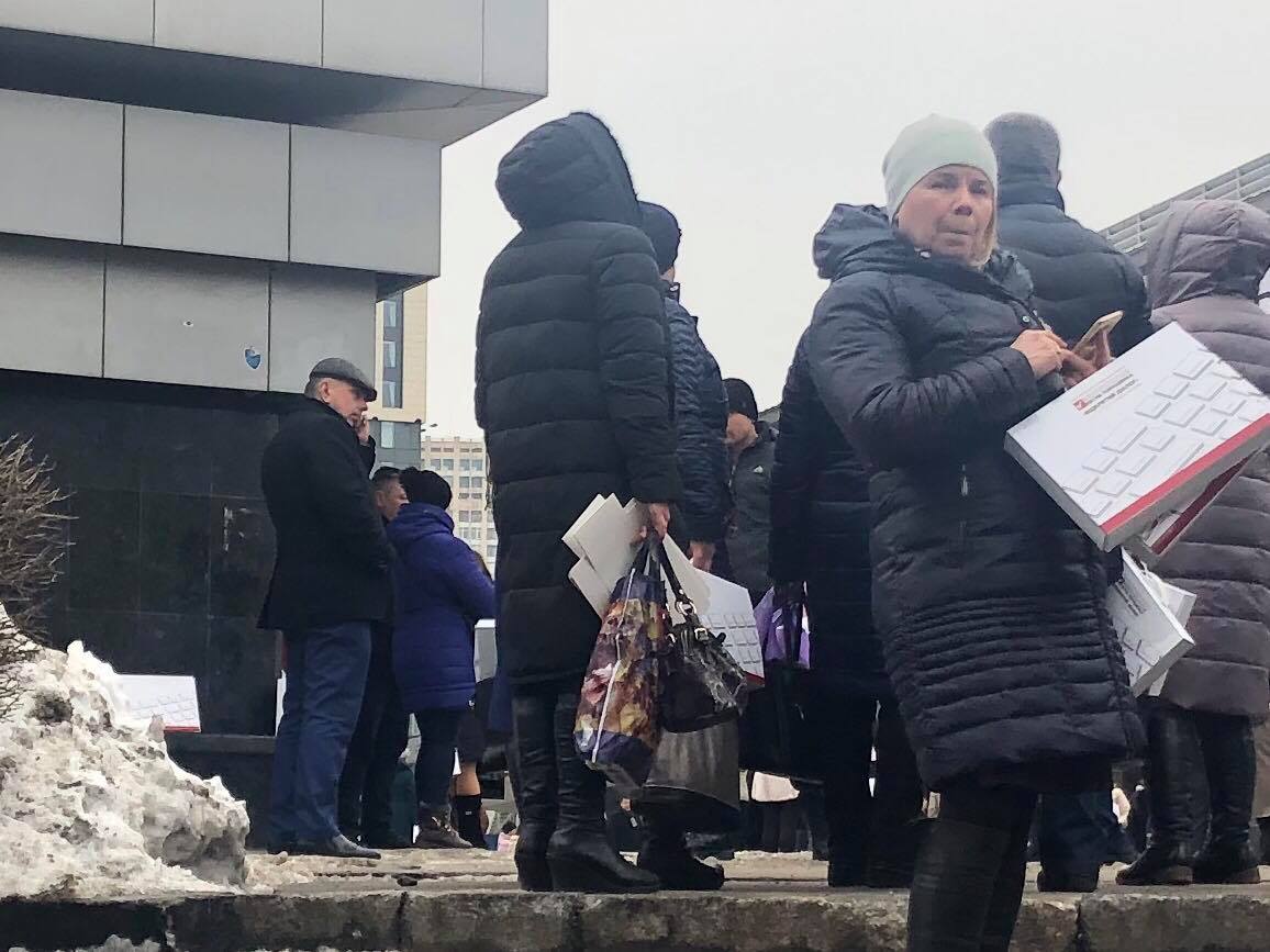 14:30 Форум завершился. Люди выходят из зала. Некоторые несут в руках картонные коробки с брошюрами, агитлистовками и календарями.