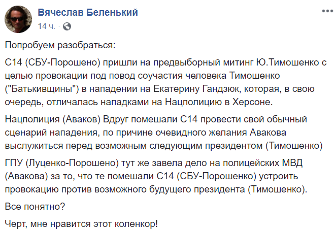 ГПУ (Луценко-Порошенко) тут же завела дело на полицейских МВД (Авакова) за то, что те помешали С14 (СБУ-Порошенко) устроить провокацию против возможного будущего президента (Тимошенко)".
