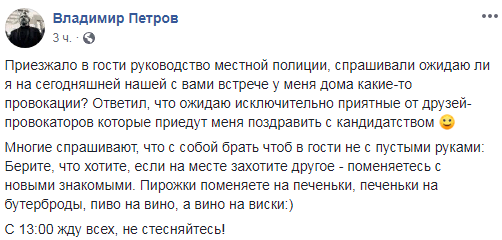 "Приезжало в гости руководство местной полиции, спрашивали ожидаю ли я на сегодняшней нашей с вами встрече у меня дома какие-то провокации? Ответил, что ожидаю исключительно приятные от друзей-провокаторов которые приедут меня поздравить с кандидатством", - говорится на его Facebook-странице.
