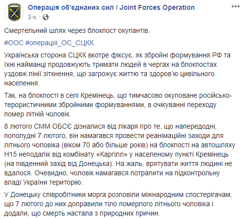 На пункте пропуска в селе Кременец Донецкой области пожилой мужчина умер, ожидая в очереди на переход. Об этом сообщает пресс-службу штаба операции Объединенных сил в Facebook.