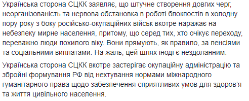 В штабе отметили, что украинская сторона зафиксировала, как вооруженные формирования РФ и их наемники продолжают держать людей в очередях на блокпостах вдоль линии соприкосновения, что угрожает жизни и здоровью гражданского населения.