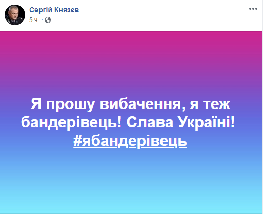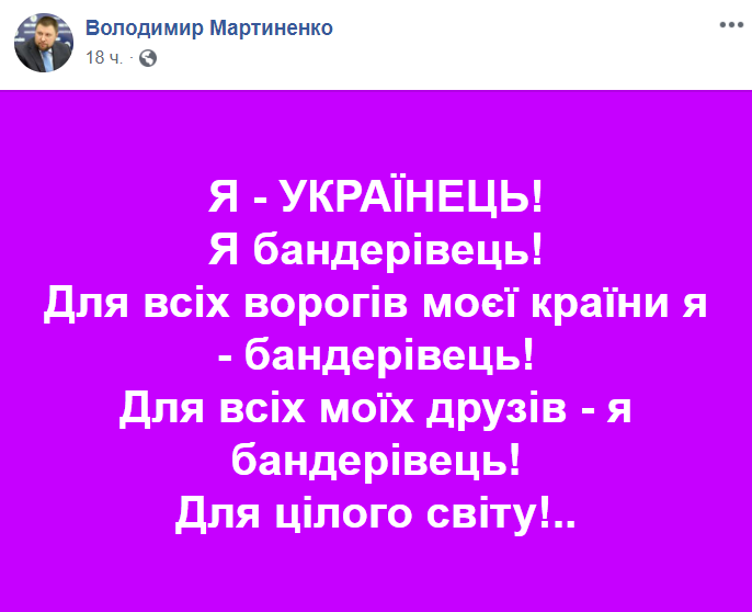 "Я - украинец! Я бандеровец! Для всех врагов моей страны я - бандеровец! Для всех моих друзей - я бандеровец! Для всего мира!", - написал он в соцсети.