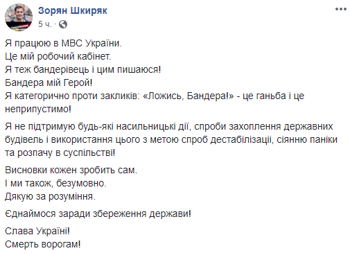 Кроме того, заместитель председателя Национальной полиции Украины Фацевич Александр и советник главы МВД Шкиряк извинились со словами "Я тоже бандеровец".