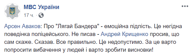 "Про "Ложись Бандера" - это эмоциональная подлость. Это недостойное поведение полицейского. Не писал - Андрей Крищенко просил, что сам скажет. Сказал. Все правильно. Это недопустимо. За это стоит попросить прощения у людей и стоит сделать выводы!", - максимально обтекаемо высказался министр.