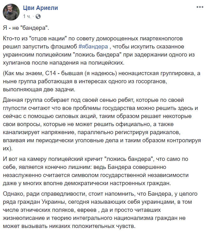 Украинский волонтер из Израиля Цви Ариели ответил на полицейскую акцию в сети своей - "Я не бандера".