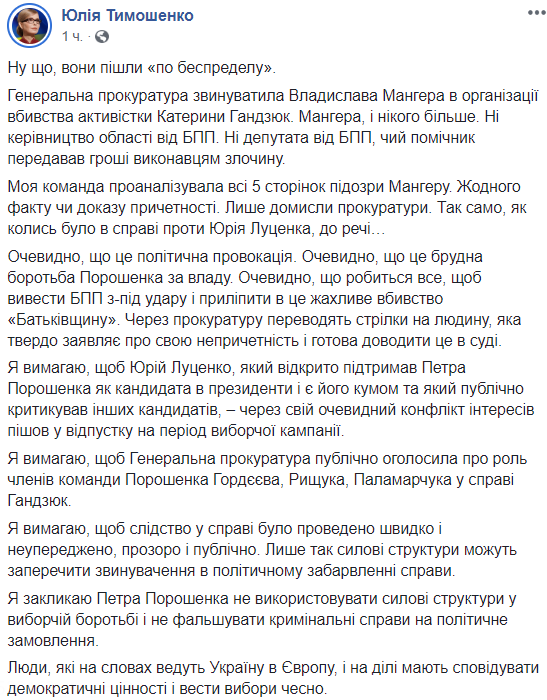 Я требую, чтобы Генеральная прокуратура публично объявила о роли членов команды Порошенко Гордеева, Рыщука, Паламарчука по делу Гандзюк", - написала Тимошенко в Facebook.