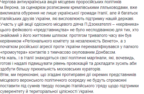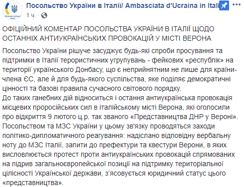 В частности, посольство осудило попытку поддержки террористических группировок в Италии. К таким действиям относится антиукраинская провокация, которая заключалась в открытии 9 февраля "представительства ДНР" в Вероне. В связи с этим посольство и МИД Украины направили ноту итальянской стороне, а также запросы властям Вероны с протестом против провокации, выясняется также юридический статус этого "представительства".