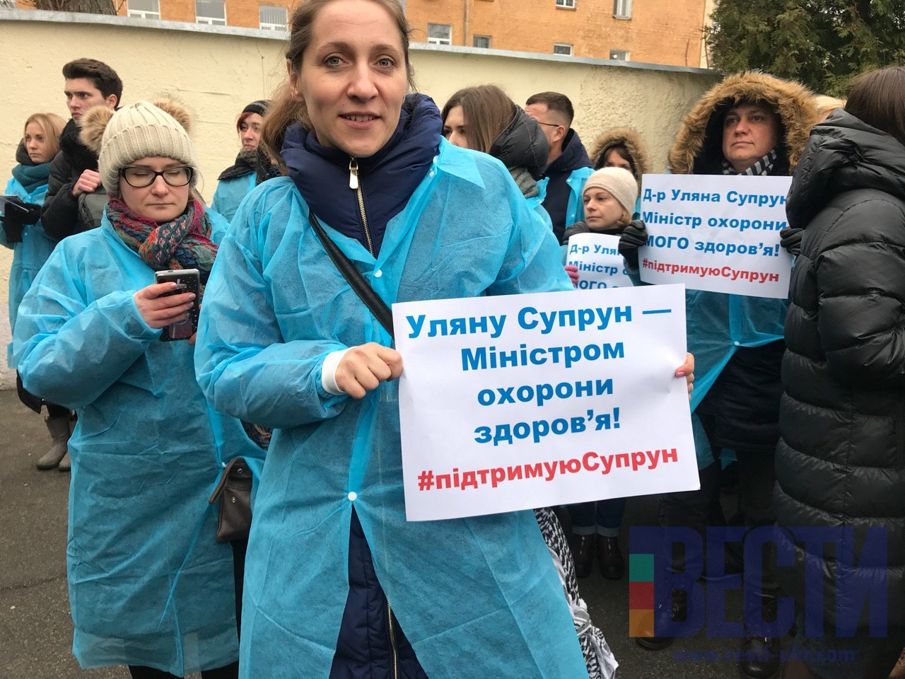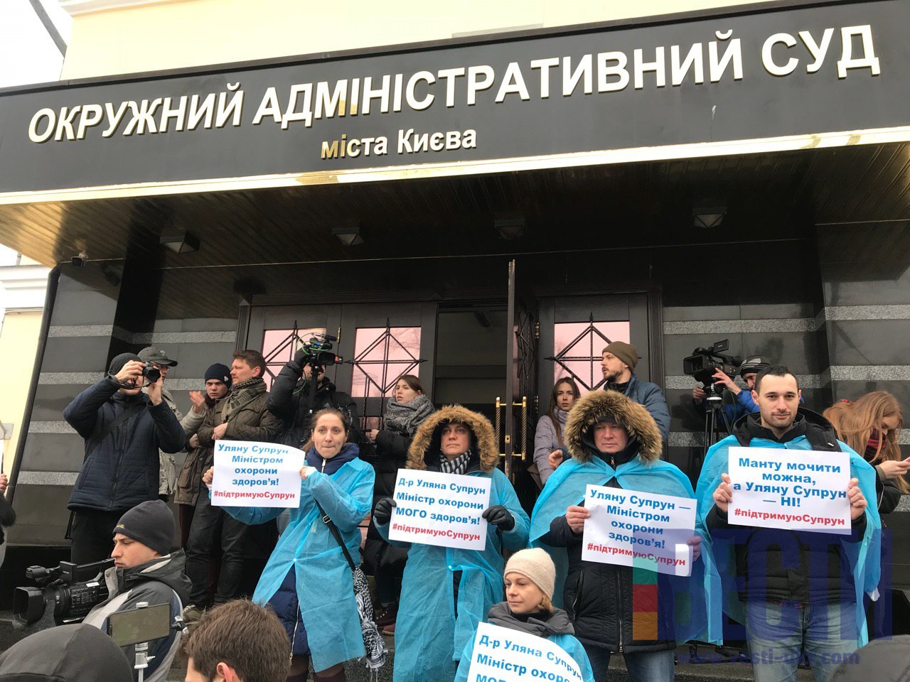 Около 13:00 под судом собрались люди в поддержку МОЗ и трансформации системы здравоохранения. Здесь выступили, как сторонники, так и противники Ульяны Супрун. Здесь же находится и заместитель министра экономического развития Максим Нефедов. Он держит в руках плакат "Руки геть від Супрун".
