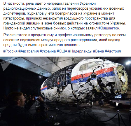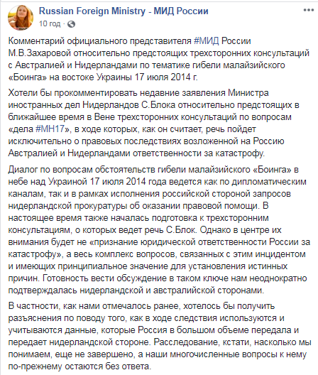 "Хотели бы прокомментировать недавние заявления министра иностранных дел Нидерландов Стефа Блока относительно предстоящих в ближайшее время в Вене трехсторонних консультаций по вопросам "дела МН17", в ходе которых, как он считает, речь пойдет исключительно о правовых последствиях возложенной на Россию Австралией и Нидерландами ответственности за катастрофу.