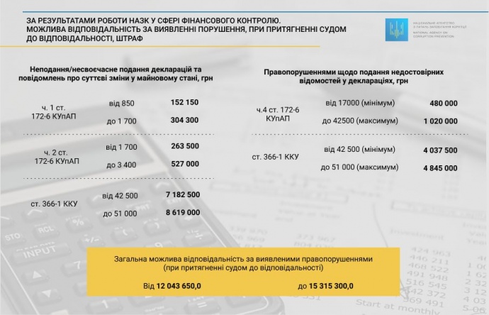 Отмечается, что в течение 2017-2018 годов в сфере финансового контроля агентство составило 273 обоснованных заключения, из них 99 - за декларирование недостоверных сведений, 5 - за незаконное обогащение, 169 - за умышленное непредоставление деклараций. Согласно закону, только в 2018 году, направлено обоснованных заключений в НАБУ - 40, в Национальную полицию - 178 и в органы прокуратуры - 36.
