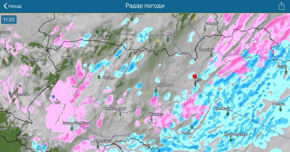 Также она опубликовала скрин текущего радара, на котором видно, что южнее Киева есть снег (розовый цвет), а осадки с балканским циклоном подкрадываются с юга.