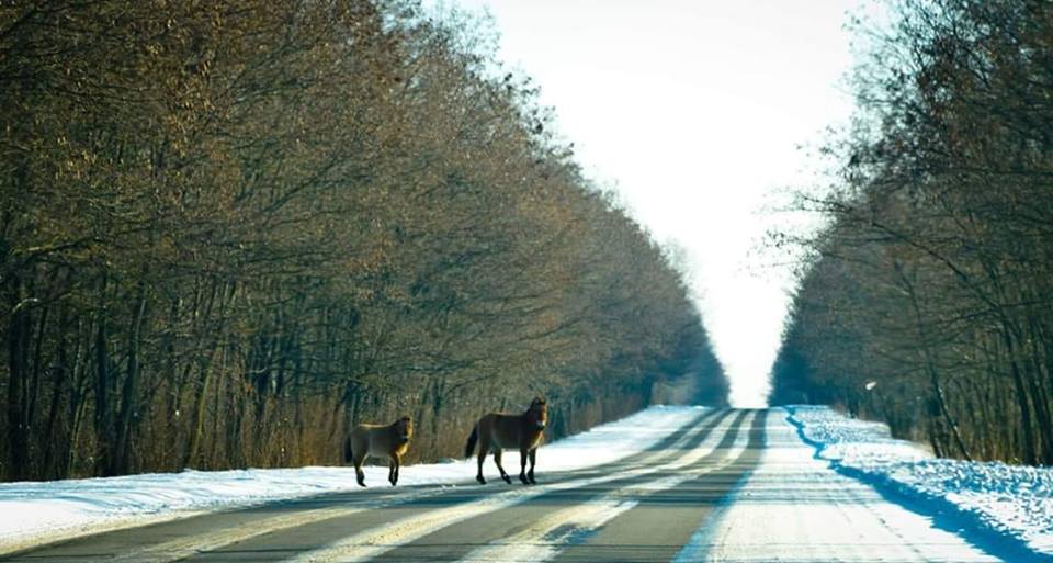 Появились фото лошадей Пржевальского, которые выходят из лесу на дорогу в зоне отчуждения Чернобыльской АЭС