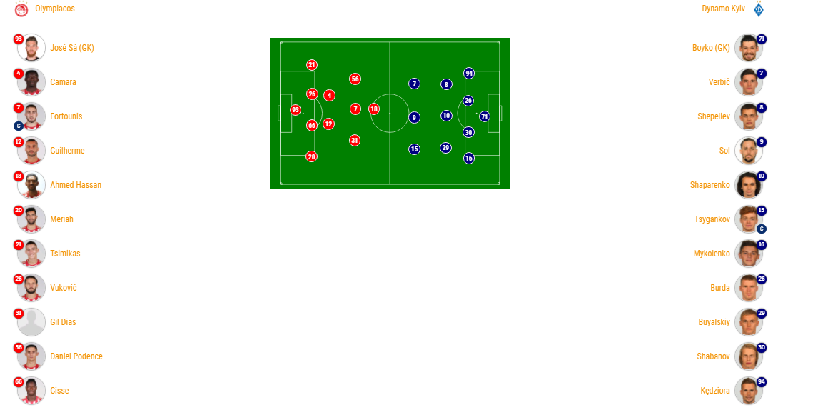 Олимпиакос: Са - Мерия, Сиссе, Вукович, Цимикас - Гильерме, Камара - Диаш, Фортунис, Поденсе - Хассан