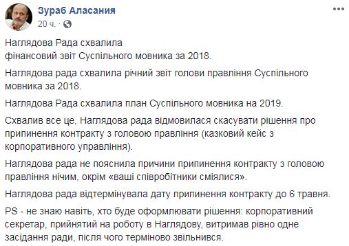 Напомним, 12 февраля набсовет ПАО "НОТУ" решил отложить решение о расторжении контракта с председателем правления НОТУ Зурабом Аласанией до 6 мая. Как рассказала в комментарии hromadske.ua и.о. председателя наблюдательного совета НОТУ Светлана Остапа, с главой Общественного Аласанией решили расторгнуть контракт с 6 мая 2019 года, чтобы его увольнение не связывали с президентскими выборами в Украине. Как сообщается, 11 членов набсовета проголосовали "за", а 4 требовали полной отмены решения об увольнении.