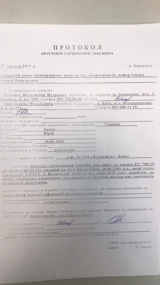 Согласно протоколу, который также выложили в соцсети, зарубежный паспорт на имя Юрия Харона изъяли, поскольку он находится на учете утраченных, похищенных, объявленных недействительными.