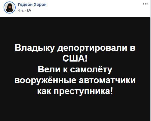 В то же время на странице Харона в Facebook появилось сообщение, "что владыку депортировали в США". "Вели к самолету вооруженные автоматчики, как преступника", - говорится в сообщении.