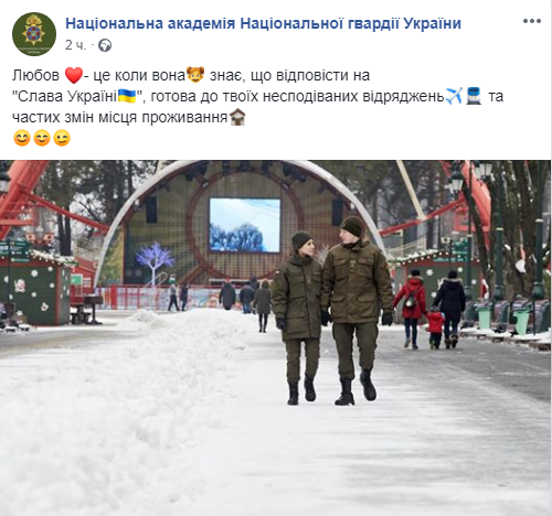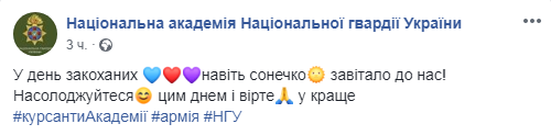 В четверг, 14 февраля, курсанты Национальной академии Национальной гвардии Украины поздравили всех с Днем Святого Валентина. Об этом свидетельствуют сообщения на странице академии в Facebook.