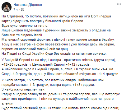 На Сретение, 15 февраля, мощный антициклон Dorit подсушит воздух в большинстве стран Европы. Погода будет сухой, солнечной и теплой. Об этом на своей странице в соцсети пишет синоптик Наталья Диденко.