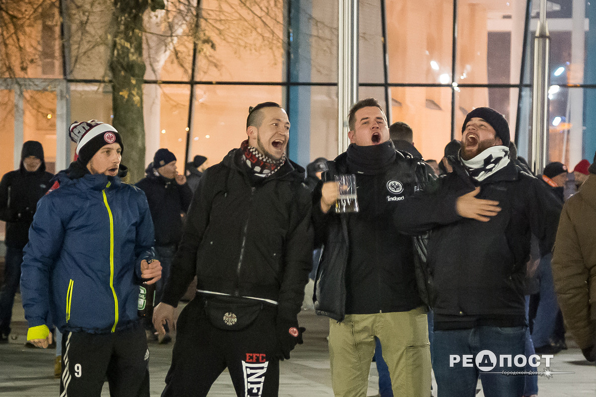 На матч в Харькове прилетели около 2700 немецких фанатов. Их сопровождают немецкие полицейские, стюарды, сотрудники клуба по работе с болельщиками. Также прибыл специальный офицер безопасности УЕФА. Делается это из соображений безопасности. На прошлом выездном еврокубковом матче "Айнтрахта" в Риме его фанаты устроили потасовки с болельщиками "Лацио". После этого в УЕФА решили дать "Айнтрахту" испытательный срок в два года. Если за это время повторится что-то подобное, то до конца этого периода все выездные матчи клуба будут проходить без болельщиков.