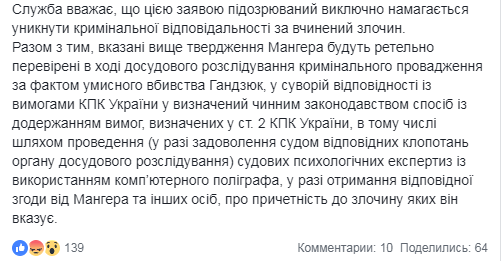 Ни одно лицо, в том числе и сам Мангер, с заявлением о совершении преступления по Гандзюк Доценко или любым другим сотрудником в СБУ не обращался. Служба безопасности считает, что этим заявлением подозреваемый исключительно пытается избежать уголовной ответственности за совершенное преступление.