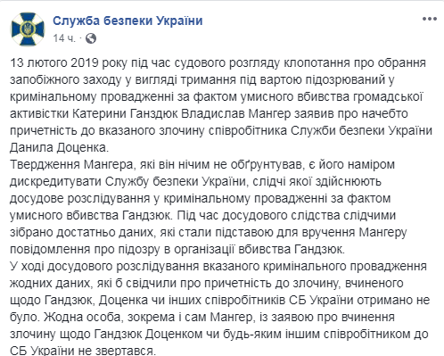 "3 февраля 2019 во время судебного рассмотрения ходатайства об избрании меры пресечения в виде содержания под стражей подозреваемый в уголовном производстве по факту умышленного убийства общественной активистки Екатерины Ганздюк Владислав Мангер заявил о якобы причастности к указанному преступлению сотрудника Службы безопасности Украины Даниила Доценко. Утверждение Мангера, которое он ничем не обосновал, является его намерением дискредитировать Службу безопасности Украины. Во время досудебного следствия следователями собрано достаточно данных, которые стали основанием для вручения Мангеру сообщения о подозрении в организации убийства Гандзюк", - сказано в сообщении пресс-службы.